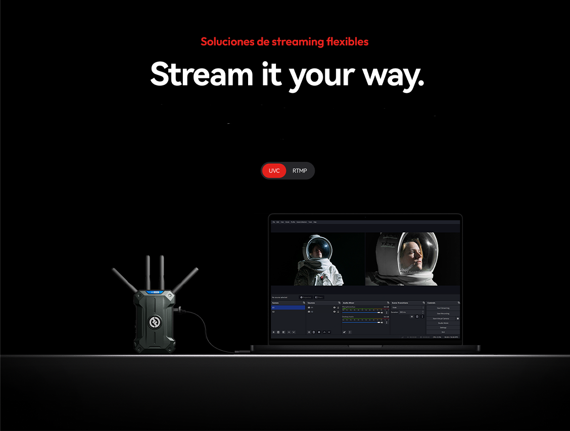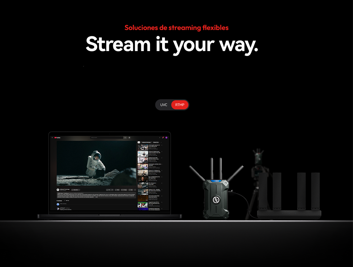 Pyro Ultra ha sido desarrollado pensando en los actuales flujos de trabajo híbridos de producción. Gracias a su compatibilidad con UVC (USB Video Class), puede conectarse directamente a un ordenador para funcionar como webcam de forma instantánea, eliminando la necesidad de capturadoras externas. Su soporte RTMP permite además transmitir directamente a plataformas web, facilitando la colaboración remota.
