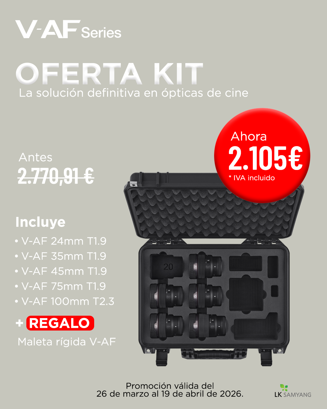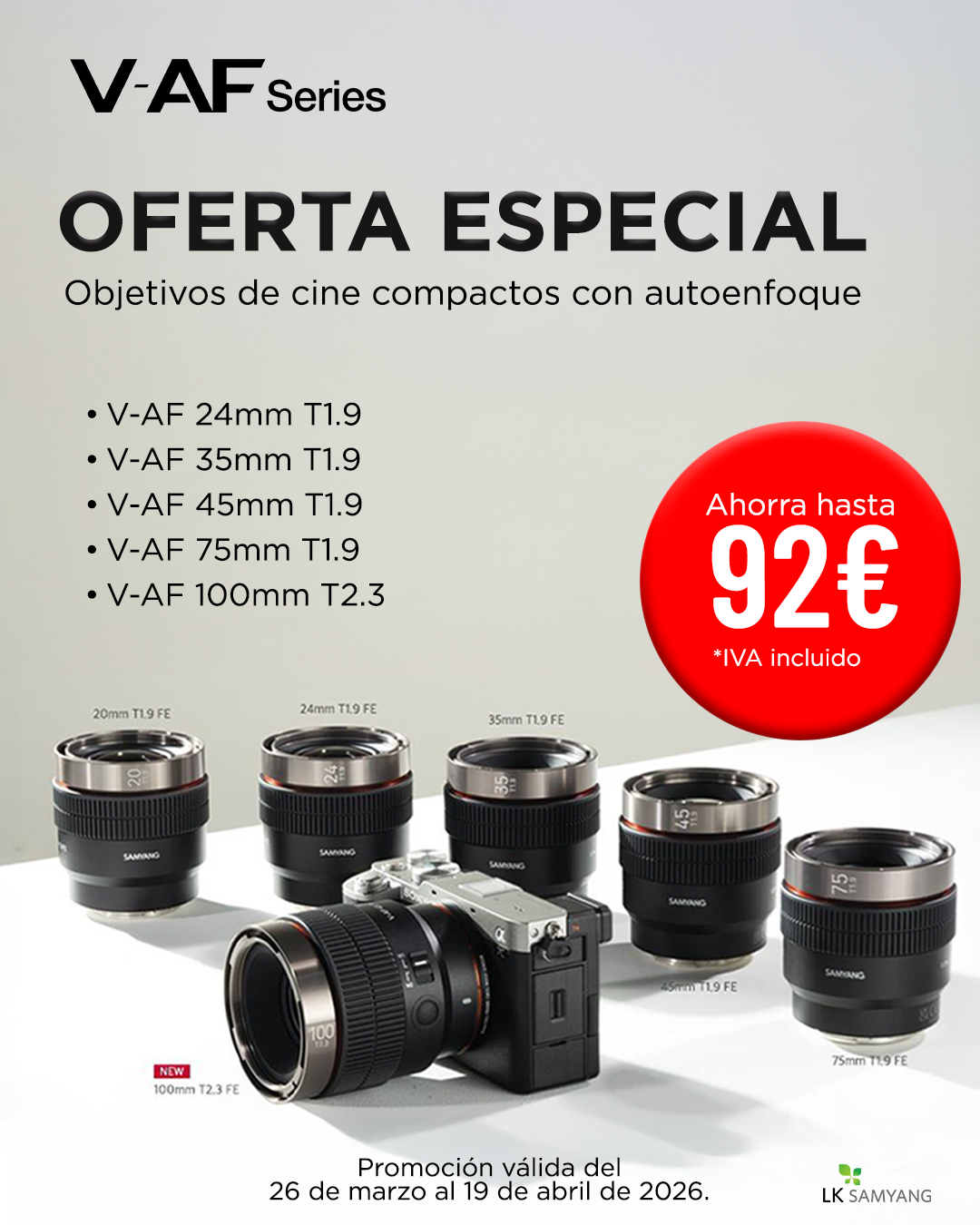 Descubre la V-AF Series, la gama de objetivos Compact Cine Autofocus diseñada para creadores que buscan una imagen cinematográfica con la máxima agilidad en rodaje. Ahora puedes conseguir los 6 objetivos de la serie con hasta 92€ de descuento, una oportunidad ideal para completar o ampliar tu equipo con ópticas pensadas para producción de vídeo profesional.