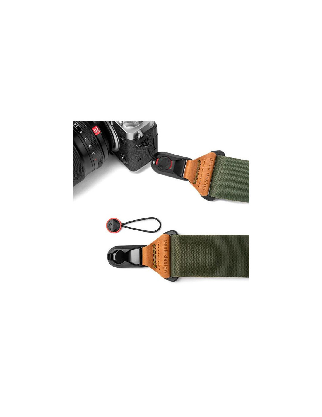 Se conecta a las trabillas de la correa o a la parte inferior del cuerpo de la cámara mediante una montura de anclaje de perfil ultrabajo