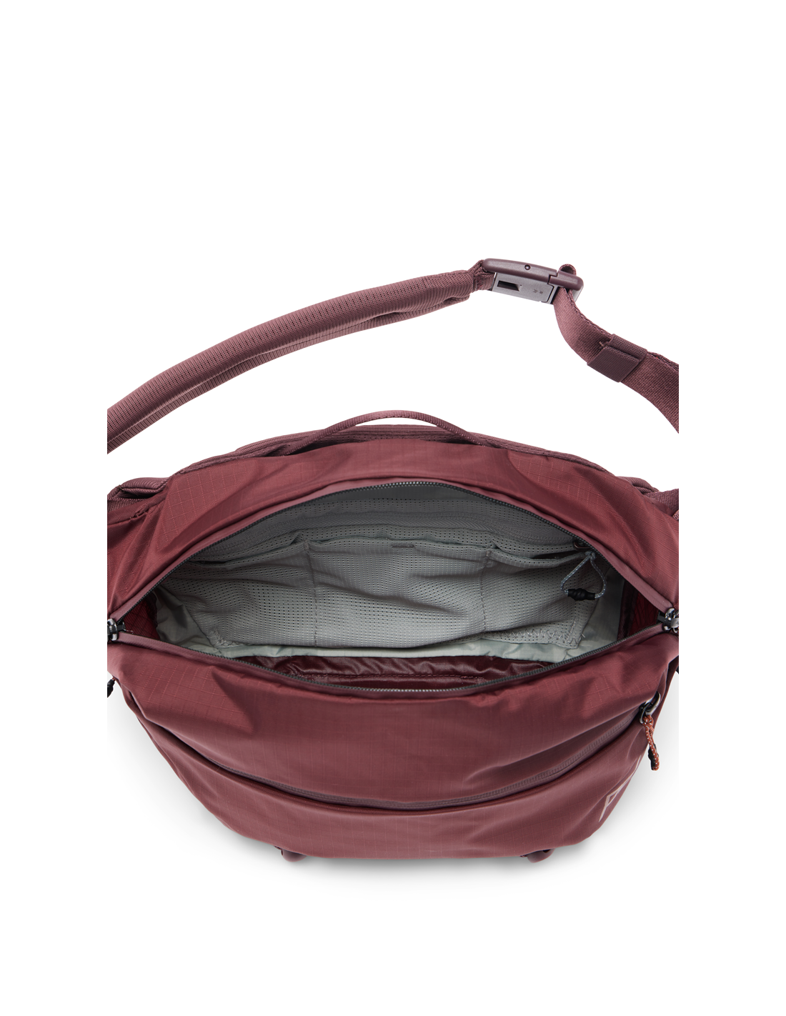 La correa de hombro acolchada de ajuste rápido con herrajes de nailon reforzado con fibra de vidrio permite llevarla cruzada o en la cintura, y el cordón estabilizador Cord Hook™ incluido se engancha para poder usarla durante el ciclismo y el movimiento activo.