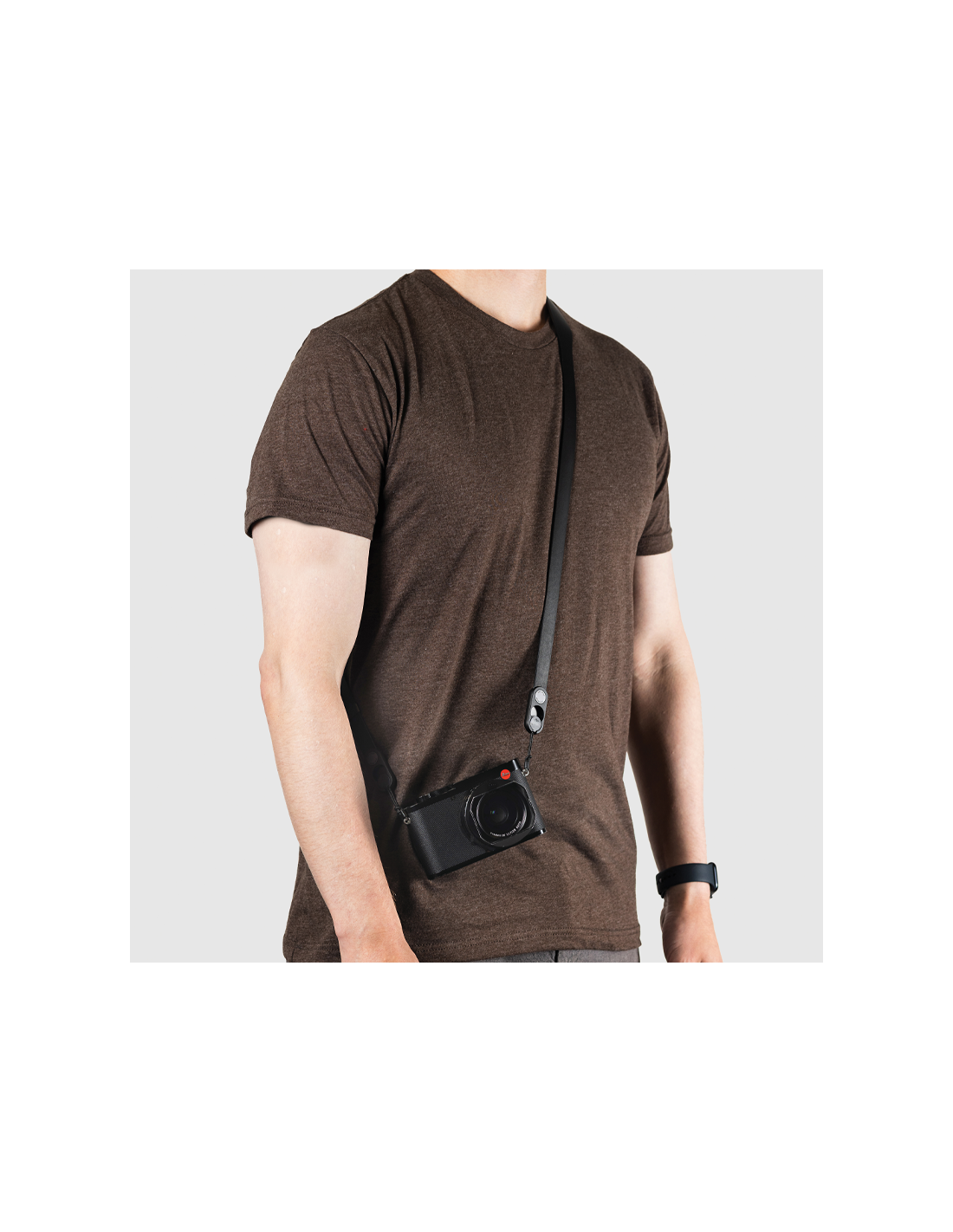 - Bucle de aluminio mecanizado para guardar la correa sobre el cuerpo o llevar cámaras compactas con un solo punto de anclaje (disponible en tallas larga, estándar y corta).