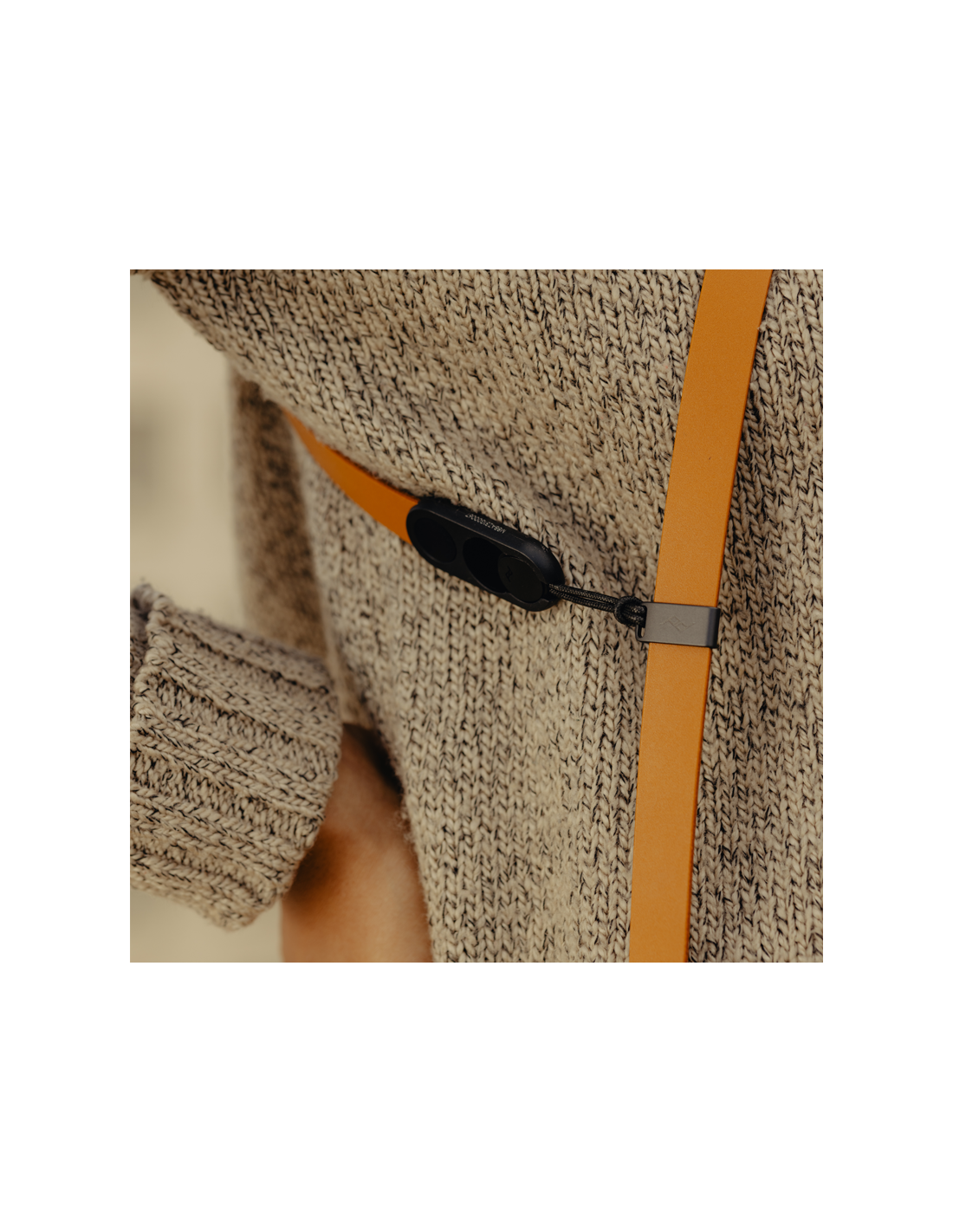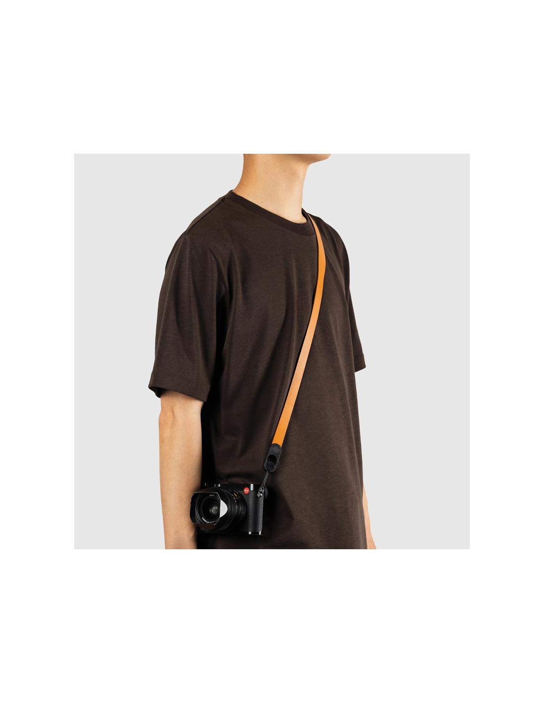 - Bucle de aluminio mecanizado para guardar la correa sobre el cuerpo o llevar cámaras compactas con un solo punto de anclaje (disponible en tallas larga, estándar y corta).