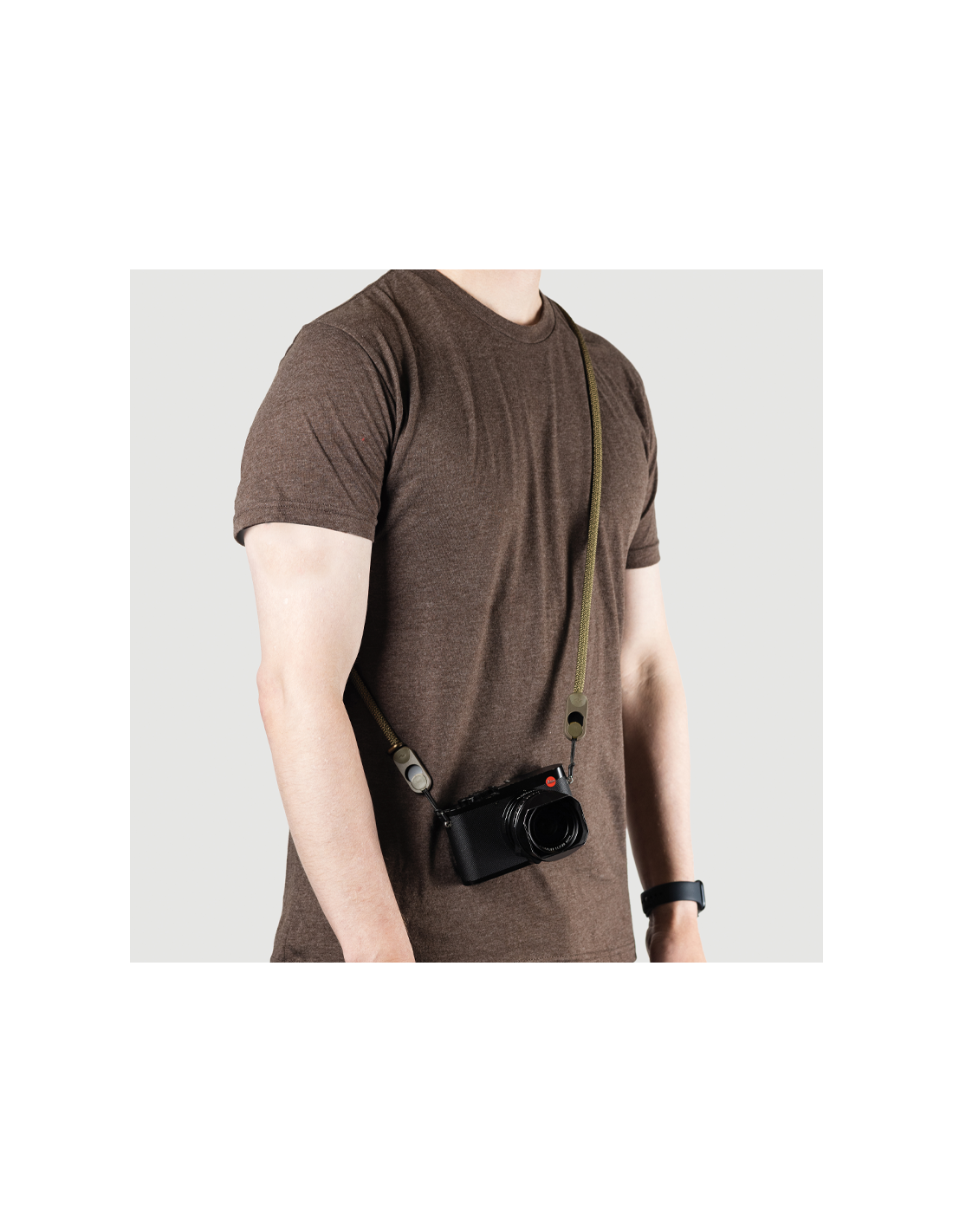- Bucle de aluminio para guardar la correa sobre el cuerpo o llevar cámaras compactas con un solo punto de anclaje (disponible en tallas larga, estándar y corta).