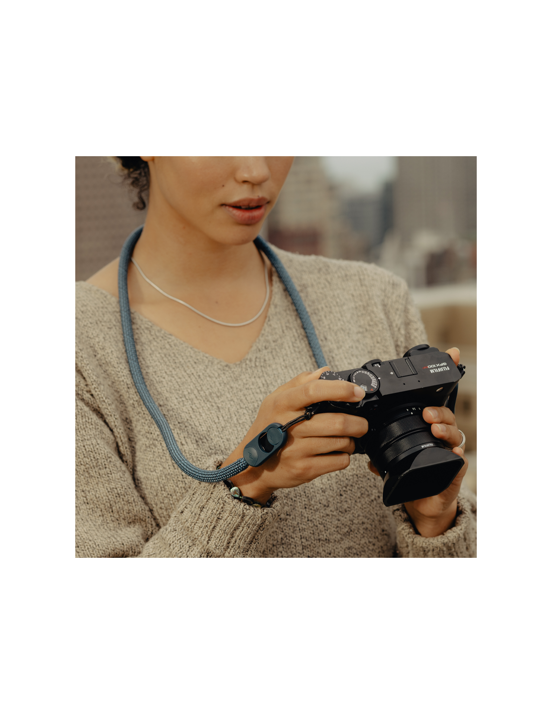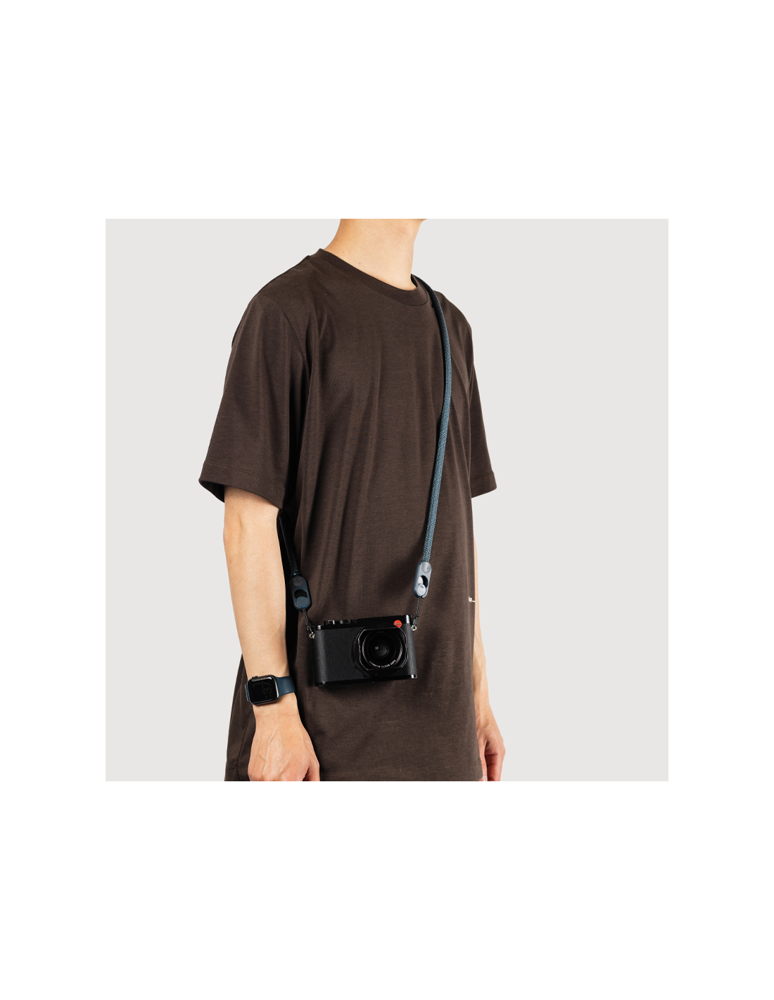 - Bucle de aluminio para guardar la correa sobre el cuerpo o llevar cámaras compactas con un solo punto de anclaje (disponible en tallas larga, estándar y corta).